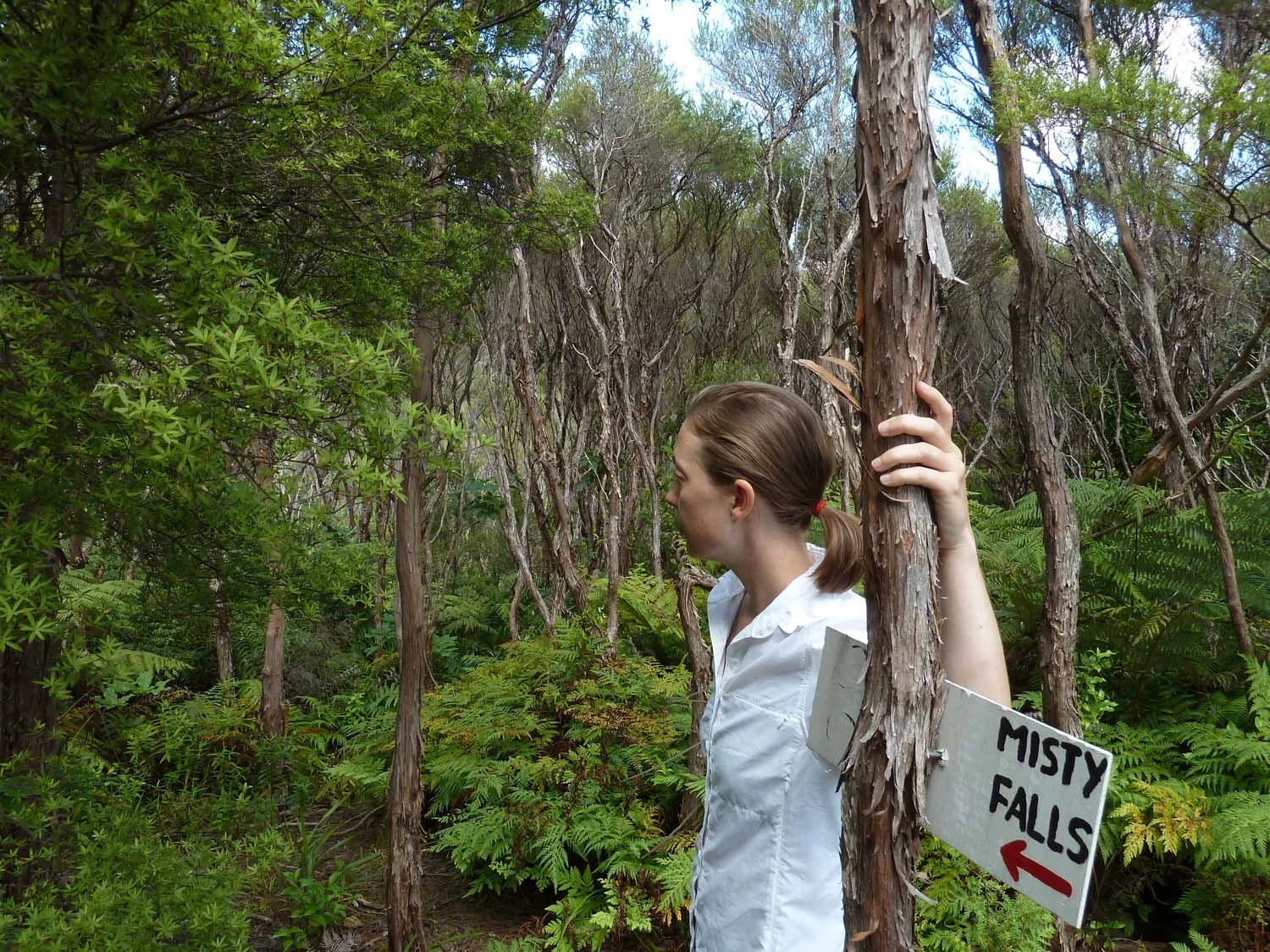 We worked our way up a hill and through tall grass until we entered a pine forest. This was no ordinary forest. Visibility went deep. Each tree was strategically placed and separated into endless rows. It held a man-made design of equal height, distance, and symmetry, all of which resulted in an eerie feeling. We strolled across the thick bed of pine needles, hand-in-hand, listening to the distinct call of tui birds in the tree tops.